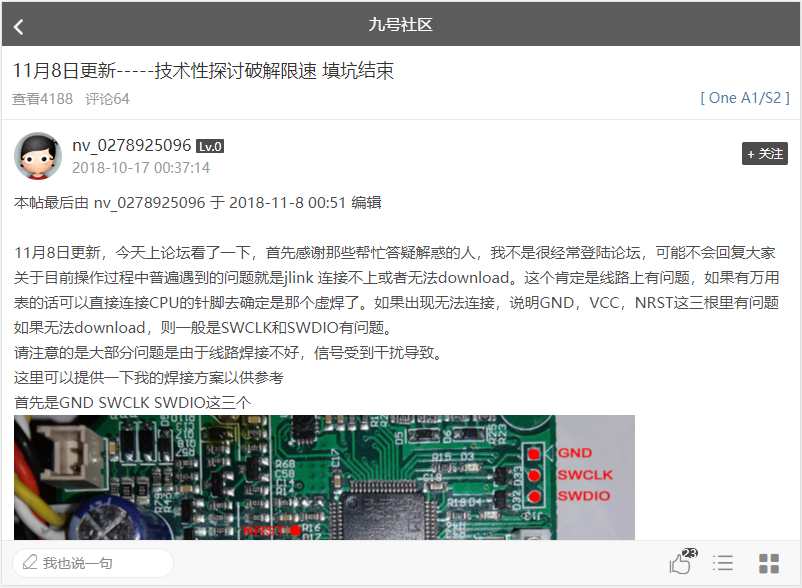 帖子里描述的方法是使用 JLink V8 之类的 ARM模拟器把网友编写的固件刷入主板,对于我一个手残来说,首先是硬件成本,从 JLink ,到铜线、引脚,再到电烙铁和焊锡全都要新买,另外虽然不用担心刷固件把车子搞坏,但是万一手残把主板焊坏,那就死定了。